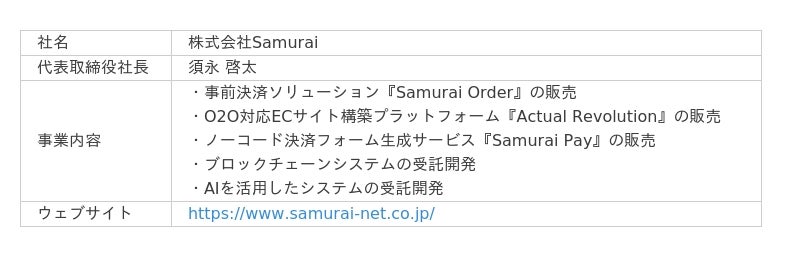 株式会社Samuraiは、キャッシュレス決済や会員管理、販売促進機能を統合したスマートフォン向けアプリケーションサービス「Samurai Order from Air Beyond」、ノーコードで決済用フォームを作成できる「Samurai Pay」、さらにNFCを活用したO2O(Online to Offline)ソリューション「Actual Revolution」などを展開しています。また、ブロックチェーン技術を活用したシステム開発や、AIを組み込んだアプリケーションの受託開発も行っています。