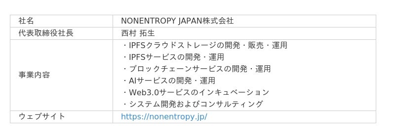 NONENTROPY JAPAN株式会社は、Web3.0社会に必要なインフラとして、IPFSおよび分散ストレージ事業を展開しています。世界中のすべての人にとって公平に扱えるインフラを提供し、Web3.0社会に不可欠な事業の実現に取り組んでいます。
