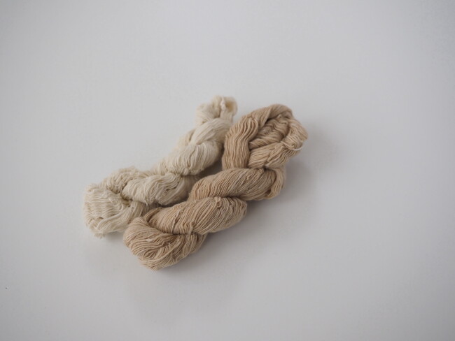 鴨川和棉農園、田畑氏の協力のもと、チャルカ(※インドの糸車)による手紡ぎ糸を作成。日本では工業的に手紡ぎが行われていないため、国産の手紡ぎの糸はとても貴重。綿に負荷がかからないため、空気をたくさん含み、軽くてとてもあたたかでウールにも似た風合い。ウールのようにチクチクすることもなく肌さわりがとてもやさしい。