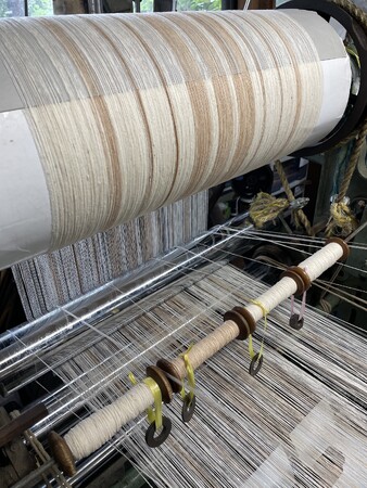 ・手紡ぎ糸は均一ではなく、とても個性があるので、一気に織り機にかけることはできず、職人さんの高い技術で少しずつ丁寧に織っている。