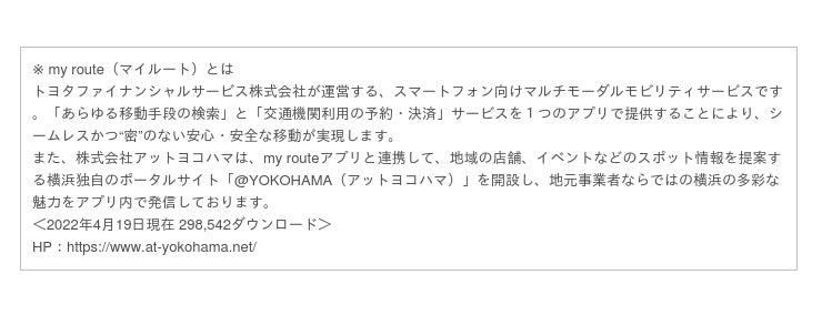 この取り組みは、「my routeアプリ」ならびにポータルサイト「@YOKOHAMA(アットヨコハマ)」で横浜の魅力を配信する弊社が、多くの方が横浜を訪れてお楽しみいただけるよう、地域の皆様と連携し街の回遊性を高め、活性化に繋げたい想いから実施に至りました。概要は下記をご参照ください。