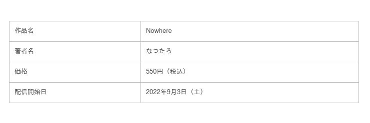 株式会社PICK UP PRESS(東京都江戸川区、 代表取締役:木田祐介)は、2022年9月3日よりデジタルコミック『Nowhere』(著・なつたろ)を各電子書籍ストアにて配信いたします。