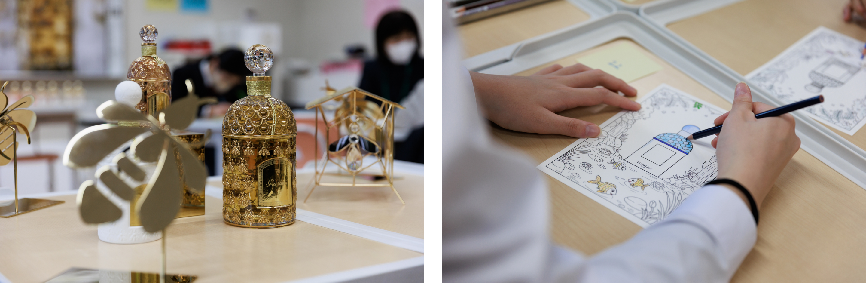 - ゲラン: 「ミツバチと共に世界を知ろう」をテーマに、約200年受け継がれた伝統と革新のサヴォアフェールを通じて、フレグランス創作の過程を探究・体験。ミツバチがコスメの原材料をはじめとした植物繁殖に不可欠な「ポリネーター(花粉媒介者)」であること、その保護の重要性を学習し、メゾンのサステナブル フレグランス〈アクア アレゴリア〉の香りとハチミツを楽しみました。