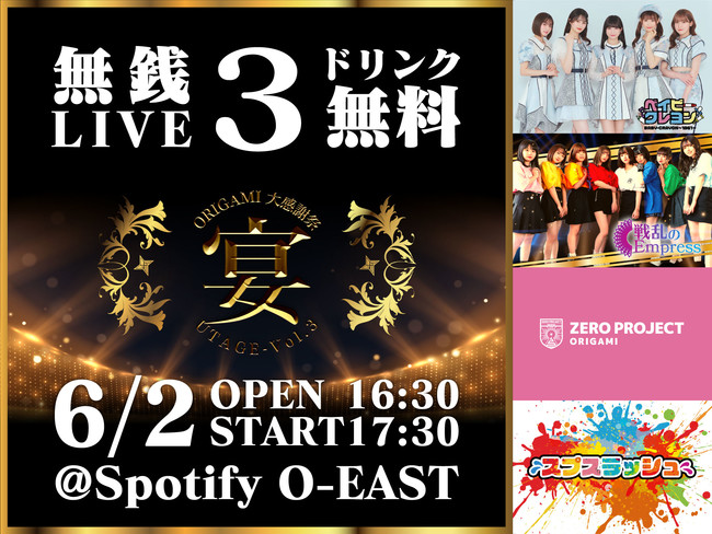 <無銭以上!?>株式会社Origami主催の完全無銭ライブ『ORIGAMI 大感謝祭 宴 Vol.3 』が6月2日にSpotify O-EASTで開催決定