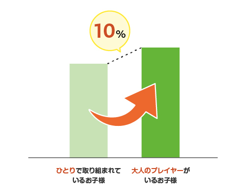 ご家族がお家で一緒にそろタッチに取り組むと、お子様が伸びる!とのお声を多くいただきます。実際に過去5年間の学習履歴データを分析すると「大人のプレイヤーがいる学習者」と「ひとりで取り組まれているお子様」では、J12(たしひきの総まとめ)をクリアした人の割合が「大人のプレイヤーがいる学習者」の方が10%程度高くなっています。