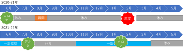 ミャンマーでは、新型コロナウィルスの影響で、2020年度は学校をほぼ開校することができませんでした。高校生が2週間だけ通うことができただけで、小中学生は全く学校に通えない一年間でした。そして、2021年度には政変がおこり、政治的混乱や安全上の不安から、ほとんどの子どもが学校に通うことができませんでした。地域差はありますが、2021年度の登校率は20%ほどだったとのことです。