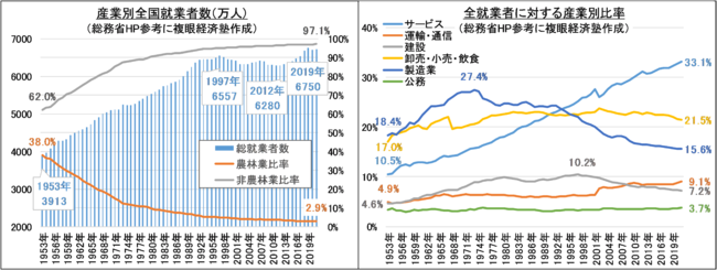 全就業者は1953(昭28)年3913万人から増加し、2019年に6750万人でピークに達し、現在はやや減少しています。今後は少子高齢化でさらに減少すると考えられます。業種別にみると、農林水産業の比率が38%から2.9%に大幅に減少しました。農林水産業従事者は、高齢者が多いことから今後さらに人出不足になる恐れがあり、無人化が必要です。