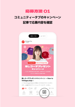 STEP1.ヴィンテージ・ファッション・アプリ「Vintage.City(ヴィンテージ・シティ)」内の「コミュニティ」ページに公開される「キャンペーン記事」で応募内容を確認。
