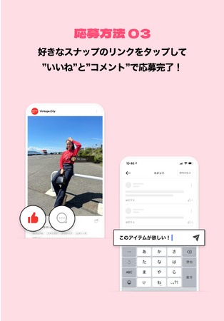 ユーザーは、Vintage.Cityアプリの「スナップ機能」に投稿された、ファッションクリエイターご本人が着用したいくつかのスナップから好きなコーディネートを選んで応募することができます。
