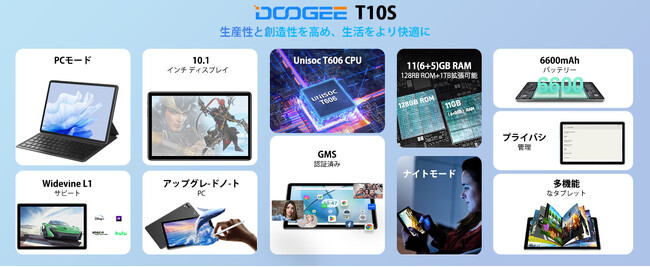 10.4インチ2000*1200解像度2K全視野角スクリーンで、ピクセル密度が高いため、より細部まで描写でき、よりシャープで鮮明な画像が得られます。DOOGEE T20 10インチandroid タブレットは、最大8GBのメモリ+最大7GBの拡張可能な仮想メモリ、合計15GBの融合メモリを搭載しています。これにより、タブレットは複数のアプリケーションを簡単かつスムーズに切り替えることができ、ラグをなくし、高速でスムーズな操作体験を提供します。