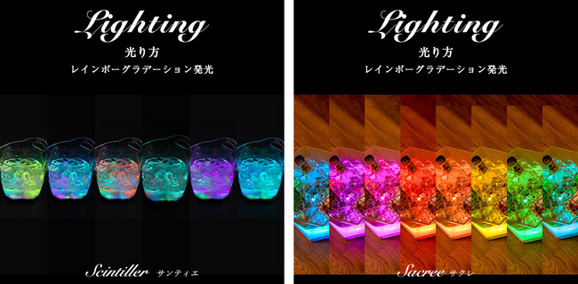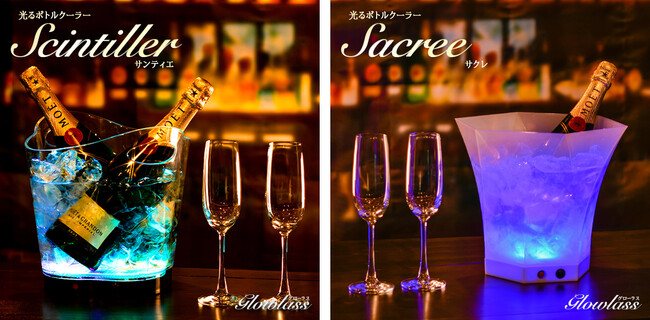 ご好評いただいております光るボトルクーラーシリーズ「GLOWLASS(グローラス)」に、新たに2点、ご家庭用にもお使いいただける新商品「Scintiller (サンティエ)」と「Sacree(サクレ)」が登場します。
