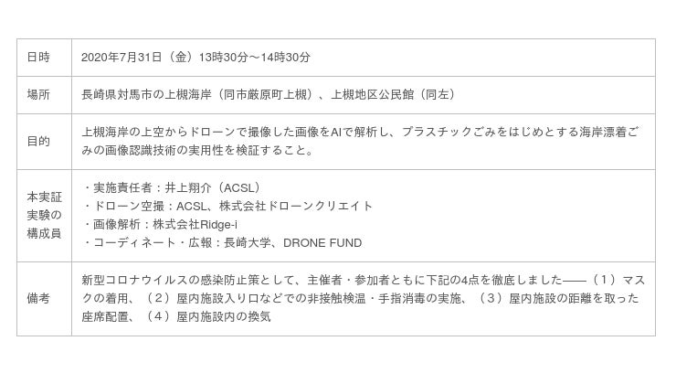 AI・ディープラーニング技術のコンサルティングと開発を行う株式会社Ridge-i(本社:東京都千代田区、代表取締役社長:柳原 尚史、以下、リッジアイ)が参画する6つの企業、2つの大学で構成される産学連携海ごみ削減プロジェクト「Debris Watchers」(旧:CCSD)のドローンチーム(実施責任者:株式会社自律制御システム研究所、井上翔介)は、2020年7月31日に、長崎市対馬市の上槻海岸(同市厳原町上槻)において、ドローンとAIを活用した海岸漂着ごみの検知システムの開発進捗と、デモ飛行の模様を公開いたしましたので、お知らせいたします。リッジアイは本プロジェクトに、AIを活用しドローンによる空撮画像を解析、ごみの種別と分布場所を識別する技術を提供しております。