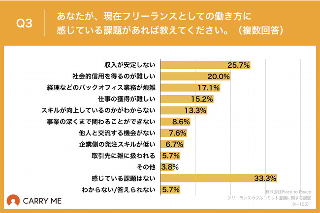 「Q3.あなたが、現在フリーランスとしての働き方に感じている課題があれば教えてください。(複数回答)」(n=105)と質問したところ、「収入が安定しない」が25.7%、「社会的信用を得るのが難しい」が20.0%、「経理などのバックオフィス業務が煩雑」が17.1%という回答となりました。