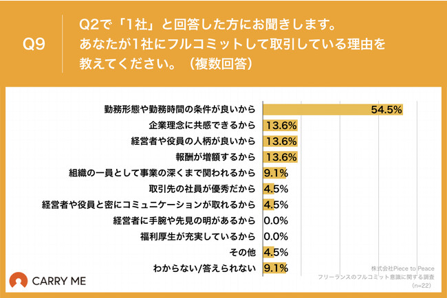 Q2で「1社」と回答した方に、「Q.あなたが1社にフルコミットして取引している理由を教えてください。(複数回答)」(n=22)と質問したところ、「勤務形態や勤務時間の条件が良いから」が54.5%、「企業理念に共感できるから」が13.6%、「経営者や役員の人柄が良いから」が13.6%、「報酬が増額するから」が13.6%という回答となりました。