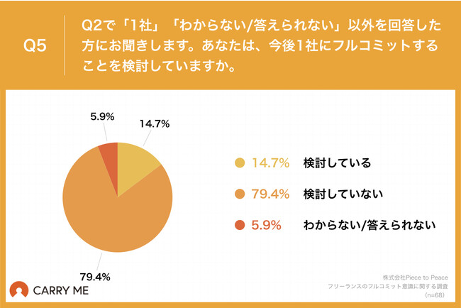 Q2で「1社」「わからない/答えられない」以外を回答した方に、「Q5.あなたは、今後1社にフルコミットすることを検討していますか。」(n=68)と質問したところ、「検討している」が14.7%、「検討していない」が79.4%という回答となりました。