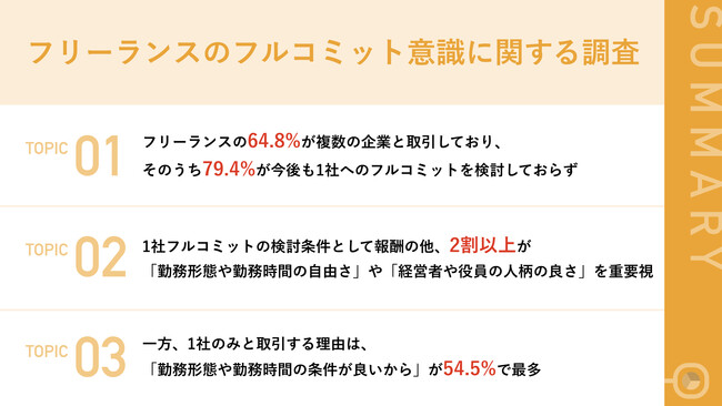 フリーランスの64.8%が複数の企業と取引しており、そのうち約15%が「今後1社にフルコミットすることを検討している」と回答しました。また、1社にフルコミットの検討条件としては報酬の他「勤務形態や勤務時間の自由さ」や「経営者や役員の人柄の良さ」を重要視することが明らかに。