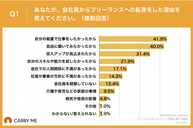「Q1.あなたが、会社員からフリーランスへの転身をした理由を教えてください。(複数回答)」(n=105)と質問したところ、「自分の裁量で仕事をしたかったから」が41.9%、「自由に働いてみたかったから」が40.0%、「収入アップが見込まれたから」が31.4%という回答となりました。