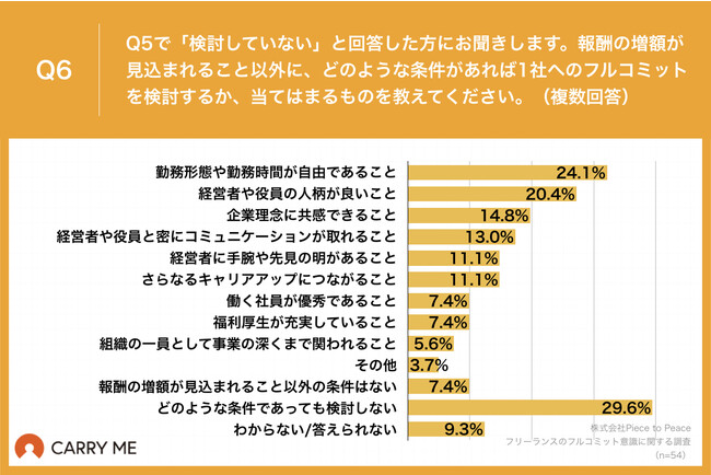 Q5で「検討していない」と回答した方に、「Q6.報酬の増額が見込まれること以外に、どのような条件があれば1社へのフルコミットを検討するか、当てはまるものを教えてください。(複数回答)」(n=54)と質問したところ、「勤務形態や勤務時間が自由であること」が24.1%、「経営者や役員の人柄が良いこと」が20.4%、「企業理念に共感できること」が14.8%という回答となりました。