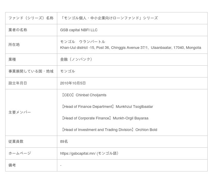 本ファンドの貸付先であるGSB社は、モンゴルのウランバートルを拠点とする金融事業者です。GSB社の事業はノンバンクと呼ばれるもので、主に一般消費者向けに自動車ローン、中小企業および個人事業主向けに小口融資の提供を行っています。