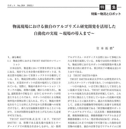 数理アルゴリズム等の開発・提供を行うTRUST SMITH株式会社(本社:東京都文京区、代表:大澤 琢真、以下TRUST SMITH)は、一般社団法人日本ロボット工業会(Japan Robot Association :JARA)の機関誌『ロボット』1月号「物流とロボット」に掲載された。