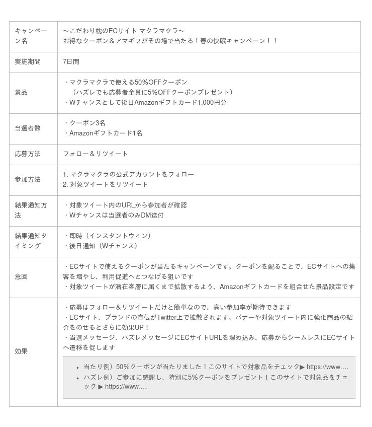 例として、架空の枕販売ECサイト「マクラマクラ」での開催を想定