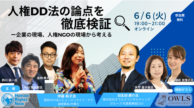 ヒューマンライツ・ナウ(HRN)ビジネスと人権プロジェクトは、株式会社オウルズコンサルティンググループ(https://www.owls-cg.com/company/)をゲストにお迎えして、2023年6月6日(火)19:00-21:00「人権DD法の論点を徹底検証 ー企業の現場、人権NGOの現場から考える」無料ウェビナーを開催いたします。