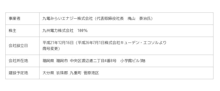 九電みらいエナジーは、平成26年7月1日に九州電力株式会社の100%子会社である株式会社キューデン・エコソルを商号変更して設立、同日付で、菅原バイナリー発電事業を西日本環境エネルギー株式会社から包括継承しました。