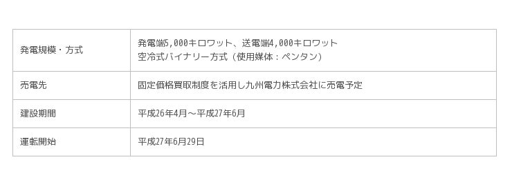 同発電所は、九重町の所有する既存地熱井を活用し、九重町が提供する地熱資源(蒸気・熱水)を用いた発電規模5,000キロワットの空冷式バイナリー方式であり、バイナリー方式としては国内最大規模です。また、自治体と民間企業が協働する国内初の地熱発電事業です。