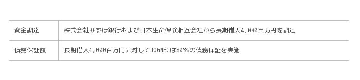 JOGMECは、九電みらいエナジーが菅原バイナリー発電事業の建設資金の一部(4,000百万円)として、株式会社みずほ銀行および日本生命保険相互会社から長期借入しており、この80%に対する債務を保証しています。