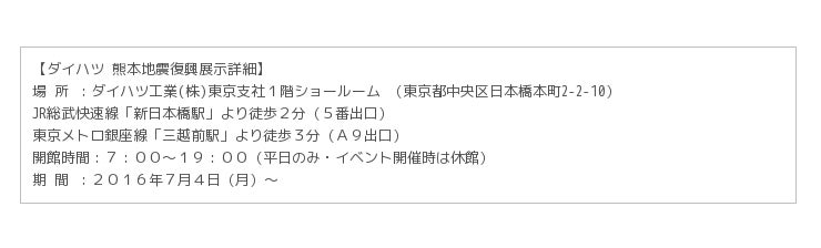 ダイハツ工業株式会社(以下、ダイハツ)は、7月4日(月)から東京支社にて、熊本地震復興支援の一環として特産品や観光情報の展示をスタートしました。