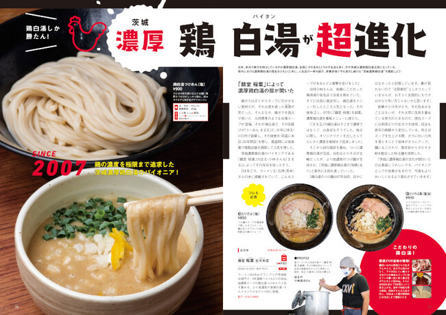 近年、県内で勢力を伸ばしているのが濃厚鶏白湯。全国にその名をとどろかす名店も多く、今や茨城は濃厚鶏白湯王国になっています。県内における濃厚鶏白湯のルーツをひもとくと共に、最新店の一杯をご紹介。今も進化を続ける多種多様な濃厚鶏白湯は必食です。