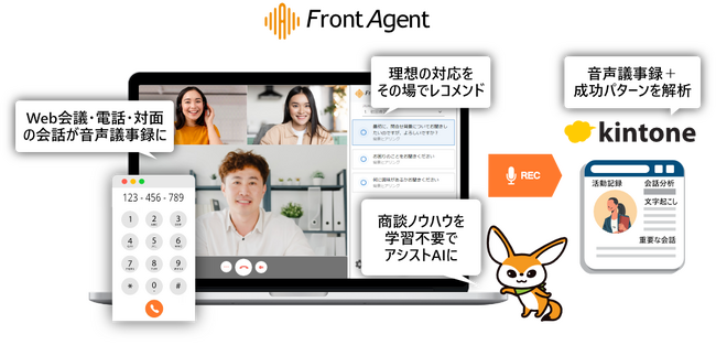 「 Front Agent(R)」は、WEB会議・電話・対面の会話から自動文字起こしと成功パターンの解析を行い、会話のアシストAI化する商談アシストプラットフォームです。