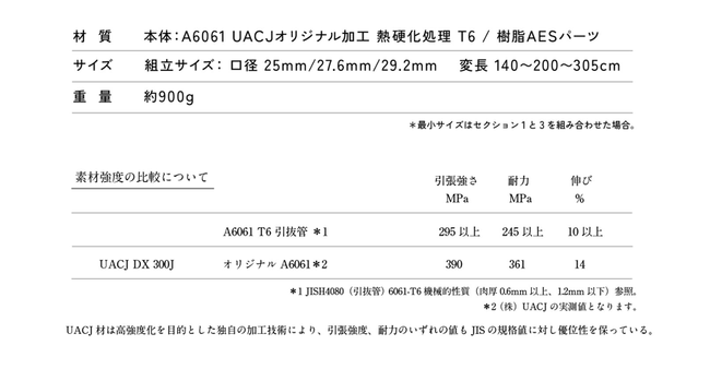 自動車や航空機のパーツを作っているUACJの物性と精度、A6061 T6はUACJならではの加工技術とAESプラパーツの優れた耐候性と強度により、アウトドアで最高のパフォーマンスを発揮するタープポールに。