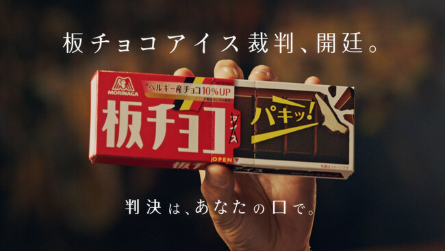 森永製菓の板チョコアイスは、パキッと分厚いチョコでバニラアイスを包んだ板チョコ型のアイスで、お菓子の板チョコと間違うくらいたっぷりのチョコを思いっきり味わえることが特長です。この度のプロモーションでは、俳優・北村一輝さんとお笑いコンビ・髭男爵を起用し、その商品特長を伝えるWeb動画「板チョコアイス裁判〜それはアイスか、板チョコか。〜」を2022年9月30日(金)に公開します。