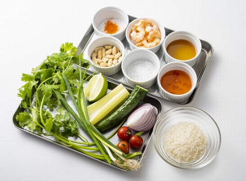 【1】パクチーはざく切り、セロリ、きゅうりは1cm角、小ネギは小口切り、赤玉ねぎは薄くスライスし、プチトマトは半分に切っておく。