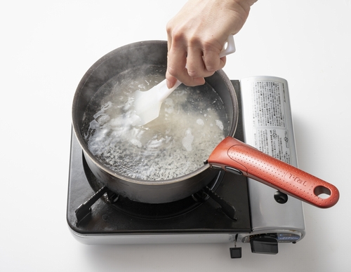 【2】鍋に塩を入れたお湯(塩分濃度1%)を沸かし、カルローズを洗わずに加え、中火で約15分茹でる。