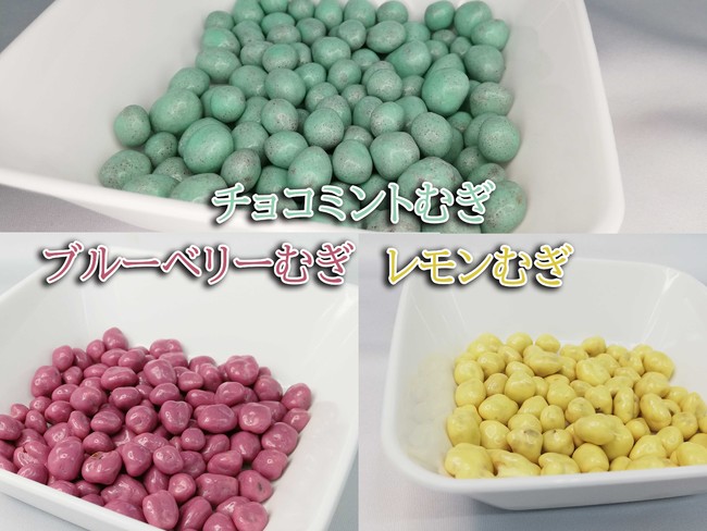 ・チョコミントむぎ …通常のむぎチョコをミント味の薄いキャンディ層でコーティングしました。ミントの爽快感とチョコの甘さがマッチし、カリっとしたキャンディとサクッとした麦の歯触りの変化が楽しめます。