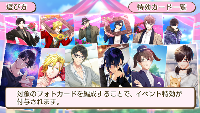 また、イベントと同時開催の「スイートバレンタインガチャ」で新登場するSSR・SRフォトカードを編成することで、イベント特効が付与され、お仕事における活動力がUPします。