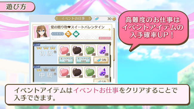 高難度のお仕事は「チョコレート」の入手確率がUP!育てたフォトカードを編成して高難度のお仕事に挑戦しましょう!