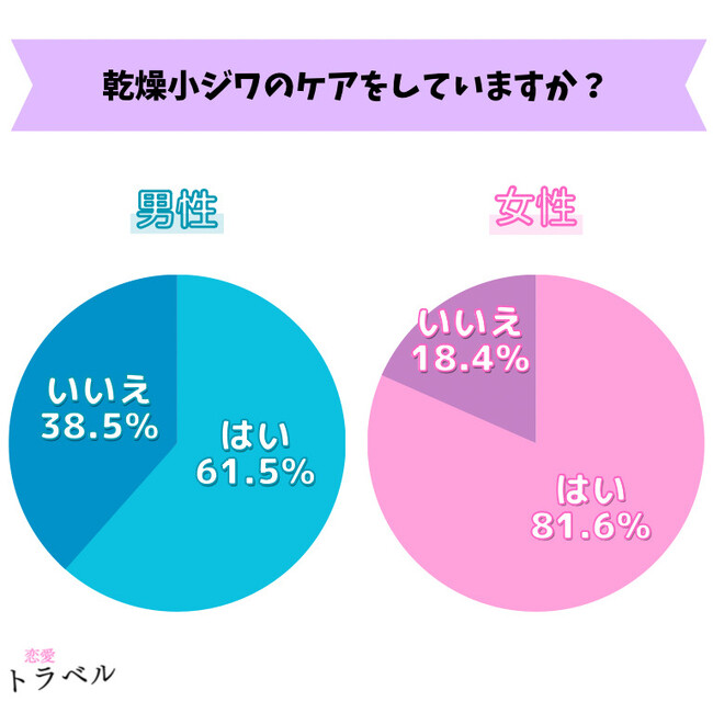 乾燥小ジワのケアをしているかについてアンケートを取った結果、男性は約6割/女性は8割の方がケアを「している」と回答しました。