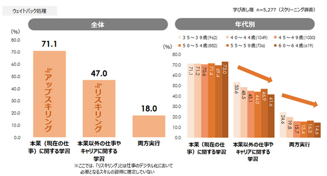2. 学び直し層のうち、「本業に関する学習」(アップスキリング)は71.1%が、「本業以外の仕事やキャリアに関する学習」(リスキリング)は47.0%が実行。ミドル・シニア就業者の学び直しは、現在の仕事に関する「アップスキリング」が多い傾向。