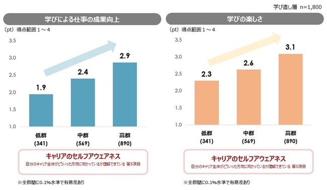 15. 「学び直し層」の中でも、「キャリアのセルフアウェアネス(内面的自己認識)」が高い場合、 「学びによる仕事の成果向上」や「学びの楽しさ」をより実感している傾向。