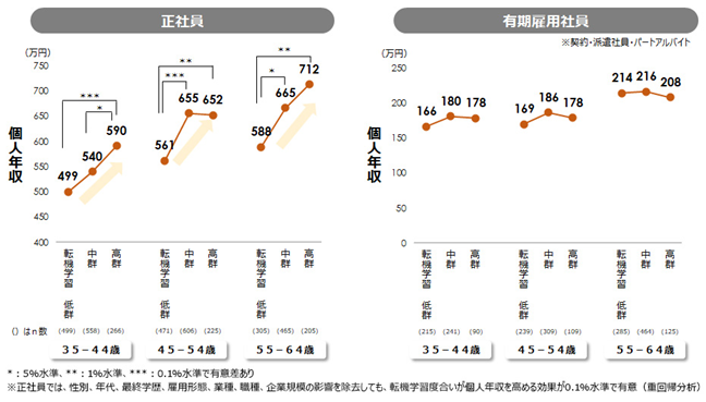 7. 正社員では、いずれの年代においても、過去の転機において学習していた度合いが高い人のほうが、個人年収が高い。一方、有期雇用社員では、転機における学習度合いと個人年収の間に関連がみられない。