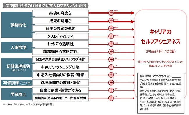 14. 学び直し意欲の行動化を促す人材マネジメント要因の一部は、「キャリアのセルフアウェアネス(内面的自己認識)」を高めることを通じて、学び直し行動を促進。特に、職務特性の「技能の高度さ」「成果の明確さ」「仕事の負荷の低さ」の影響が顕著。