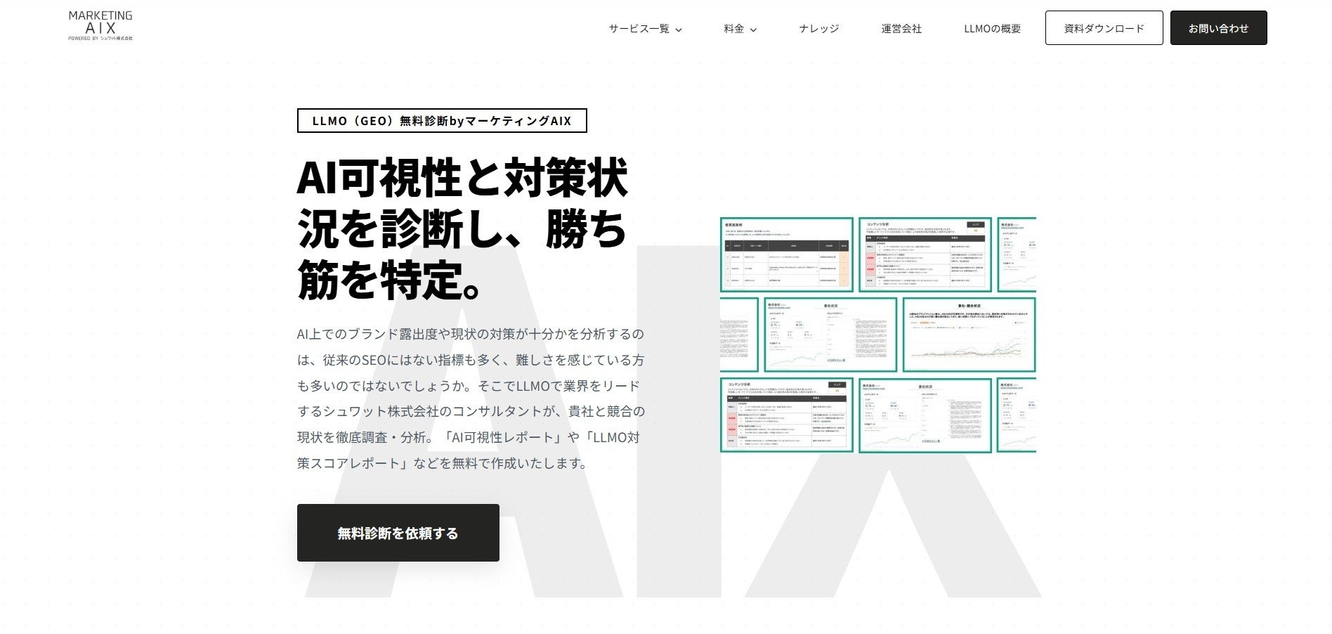 - 診断内容: 「57項目の中から特に重要度の高い項目をピックアップし、貴社の現状の可視化」+「貴社のAI上での言及・インプレッション状況の可視化」