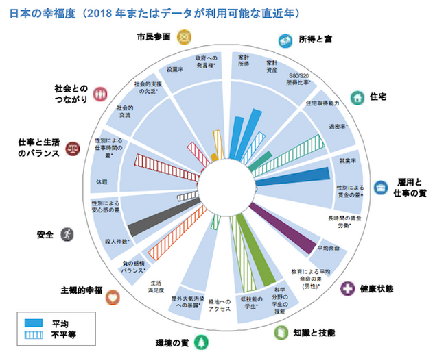OECDにより2年に1回実施される「Better Life Index(より良い暮らし指標)」を分析した「How's Life」という報告書によると、日本人は「就業率」、「平均余命」などについては非常に満足度の高い良い結果ですが、「過密率」、「休暇」、「負の感情・バランス」などはOECD平均よりも大きく劣っているという結果が出ました。