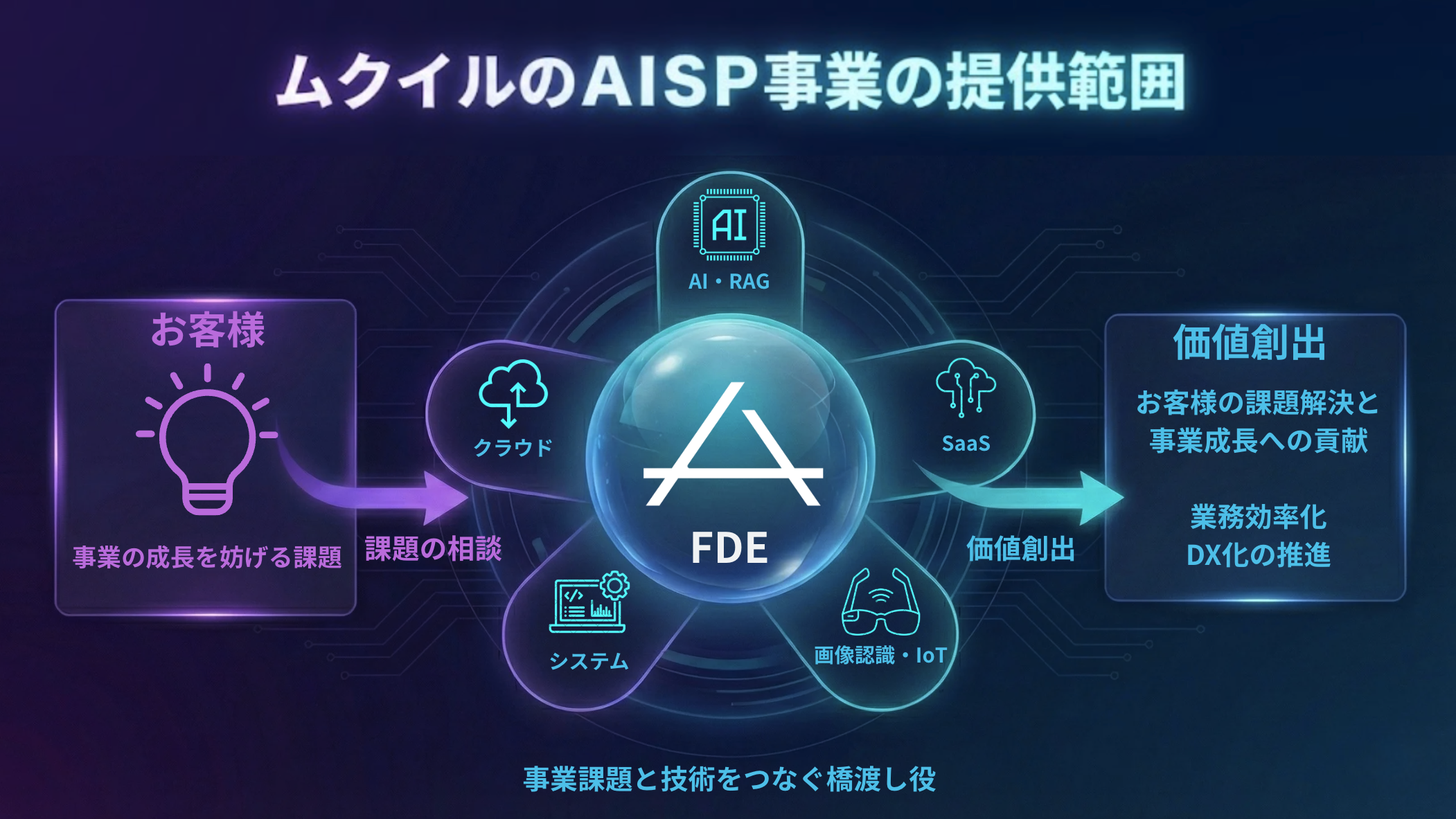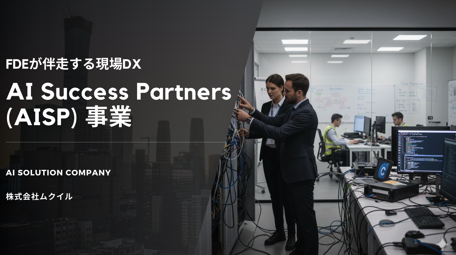 こうした状況を受け、株式会社ムクイルは、お客様の現場に入り込み、AI導入から定着まで徹底的に伴走する「AI Success Partners(AISP)事業」を立ち上げます。本事業は、海外で注目される職種 FDE(Forward Deployed Engineer) の発想を基盤とし、現場の業務理解からユースケース設計、実装、本番運用、定着支援に至るまでを一気通貫で提供することで、企業の「AI Success(AI活用の成功)」を実現することを目的としています。