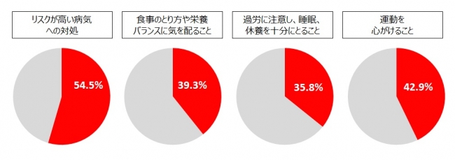 「健康応援割引」を利用して「MYCODE」を購入したお客様を対象に行ったアンケート調査では、検査結果を受けて「リスクが高い病気への対処」を「実際に行うようになった」「行おうと思うようになった」と回答した方が半数以上の54.5%となり、「栄養バランスに配慮するようになった」「睡眠や休養に配慮するようになった」という回答も多くありました。