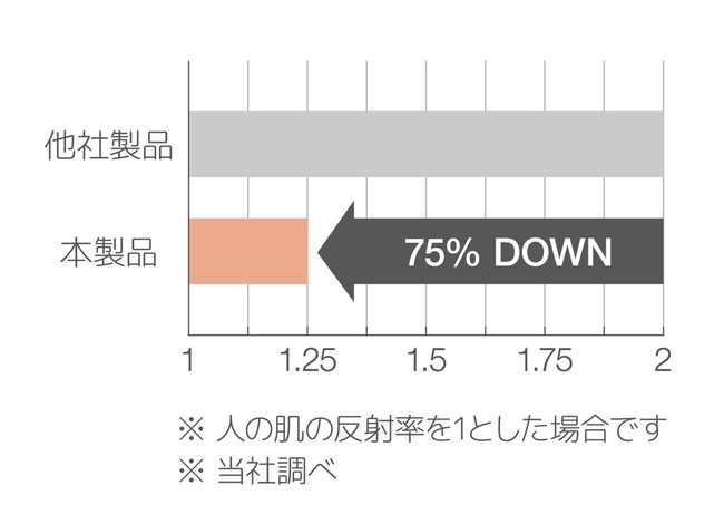 また、シールの反射率を低くし不自然なテカリを抑え、滑らかで精巧な肌色のグラデーションを実現したことで、肌に貼った際の違和感とシール感を軽減することができました。この反射率は、他社品と比べて75%抑えられており、極めて自然な肌を再現することに成功しました。肌へ貼った後は、ファンデーション等を使用して、より自然に仕上げることも可能です。