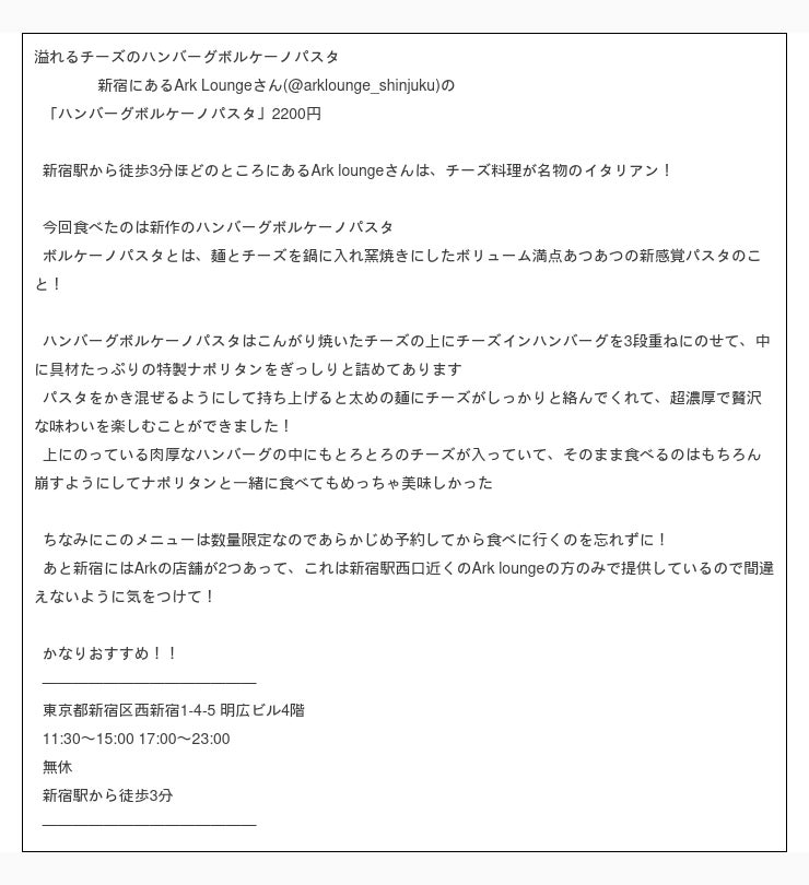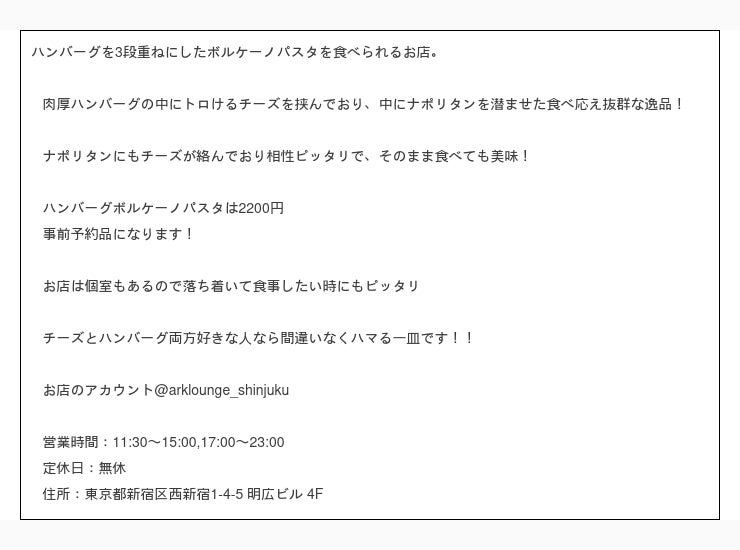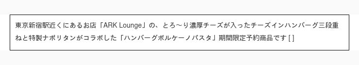 【要予約】窯焼きパスタ(溶岩パスタ)チーズインハンバーグ・ボルケーノパスタが食べれるのはここ?『Ark Lounge 新宿西口店』